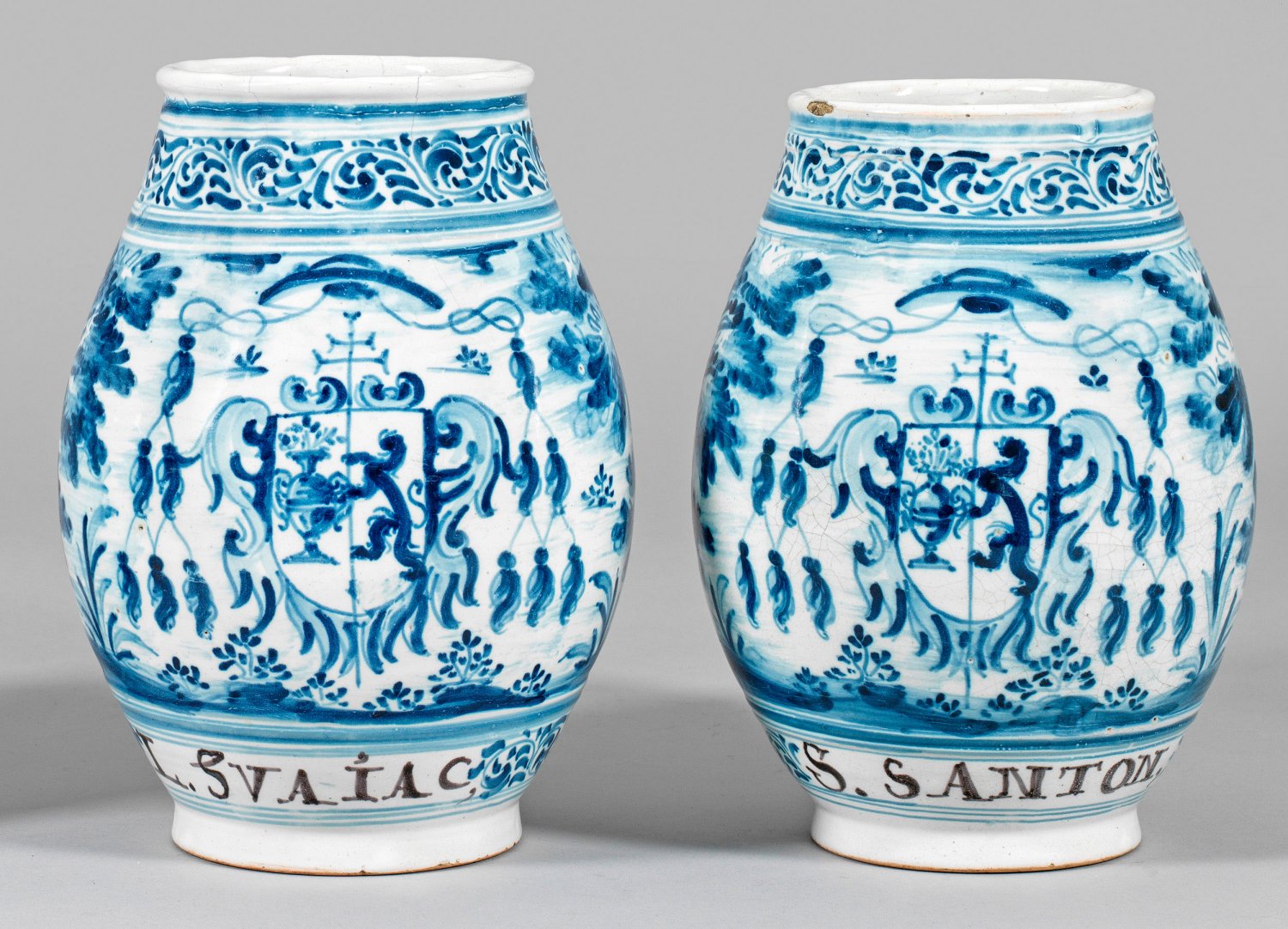 A pair of Italian Savona blue and white maiolica pharmacy jars with coat of arms of a bishop. Minor chips, further minor hairline crack to one jar.