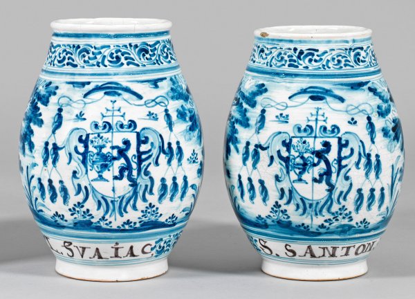Majolika. Fassform. Dekor in kobaltblauer Scharffeuermalerei, Schrift in dunklem Manganviolett. Schauseitig halbiertes Bischofswappen mit Löwe und Vase, unterhalb Schriftzug "L. SUAIAC" bzw. "S. SANTON", rücks. ein Straußenvogel bzw. ein laufender Fuchs in Landschaft. Ger. best., ein Gefäß mit ger. Haarriss. H. 25 cm- 26 cm.
