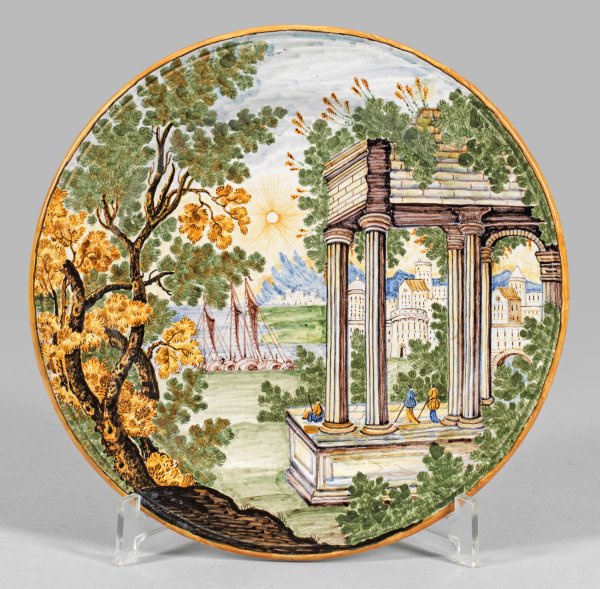 Majolika. Flache Form. Polychrom bemalt. Flächendeckender Dekor aus einer italienischen Ideallandschaft mit antiker Tempelruine und Bäumen vor einer Hafenstadt, belebt durch Figurenstaffage. D. 23,8 cm.