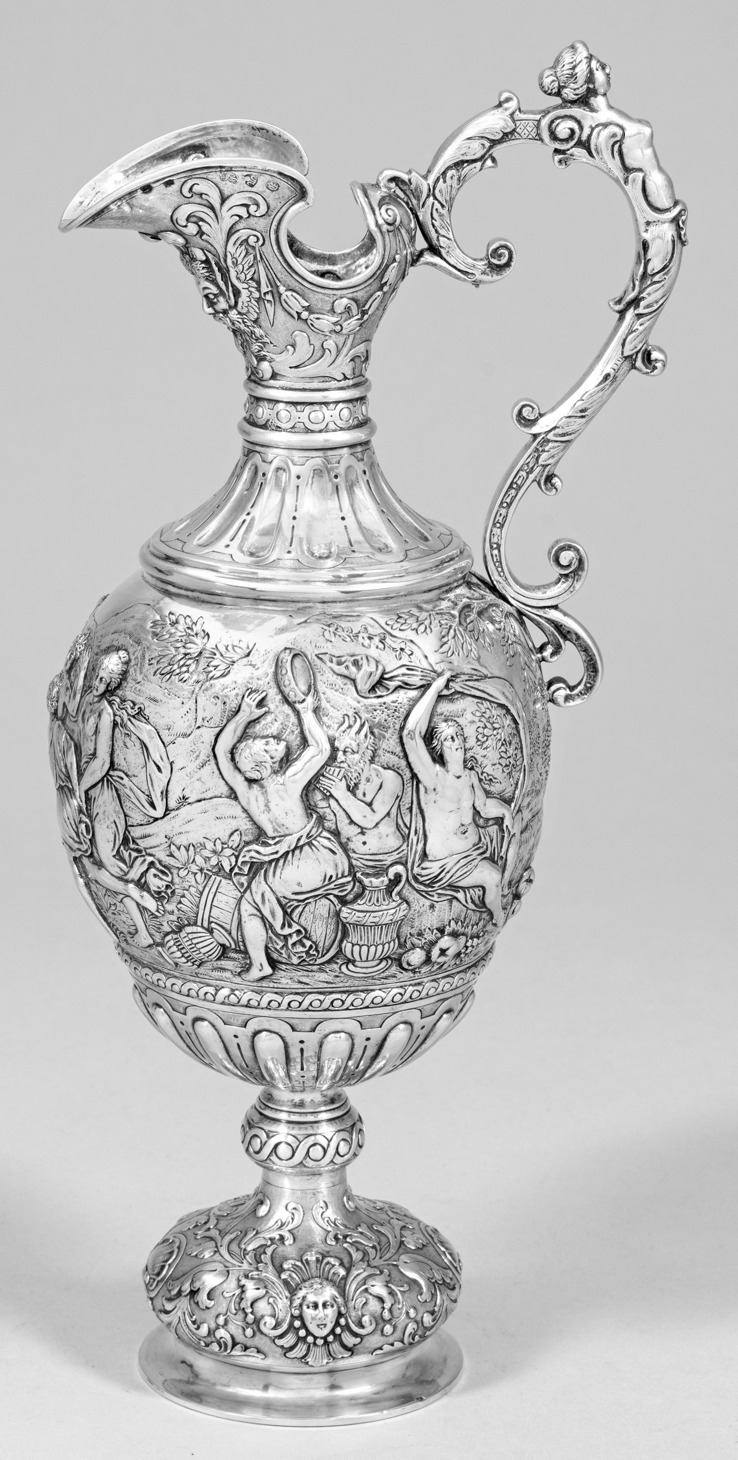 Silber. Aufgewölbter Rundfuß, übergehend in kurzen Schaft und sich bauchig erweiternden Korpus. Gerundete Schulter mit schmalem, kurzem Hals in weit ausschwingendem Ausguss endend. Hochgezogener reliefplastisch figürlich gestalteter und volutierter Ohrenhenkel. Kannenkorpus an Ansatz und Hals von Zungenfries umzogen. Stand und Ausguss mit üppigen Blattranken, Muschelwerk und reliefierten Maskaronen verziert. Zentral umlaufend auf der Wandungsmitte szenische Darstellung einer tanzenden und feiernden, antikisierten Gesellschaft mit musikspielenden Faunen und Putti vor bergiger, bewaldeter Landschaft. Gest., Pseudomarken. Gew. ca. 1010 g. H. 38 cm.