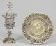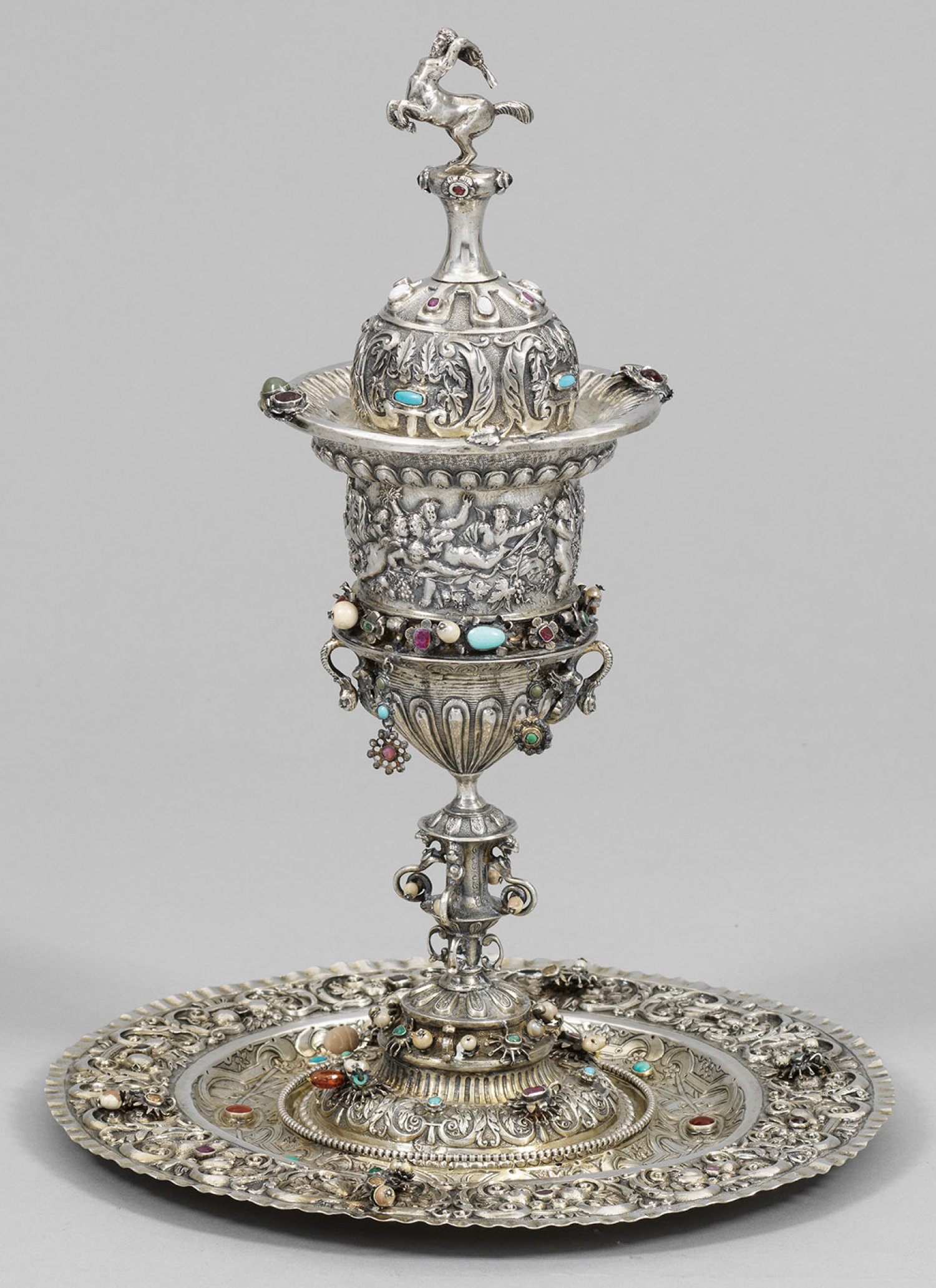Silber mit Restvergoldung. Runde Schauplatte mit wellenförmig gekniffenem Rand. Gering gemuldeter Spiegel mit Rundmedaillon, als Standfläche für Deckelpokal. Darin die erhöhte Darstellung Amors, den Wagen der Venus gezogen von einem Paar Tauben, über den Wolken lenkend. Fahne üppig verziert mit C-Schwüngen, Bandelwerk, Fruchtbündeln über fein punziertem Grund und besetzt mit silbermontierten Wachsperlen und Schmucksteinen, z. B. Granat, Türkis und Carneol. Der Deckelpokal mit rundem, mehrfach profiliert aufgewölbtem Stand, übergehend in von S-förmigen Spangen umzogenen, kurzen Balusterschaft. Kratervasenförmige Kuppa mit weit ausgestelltem Rand. Stark aufgewölbter Deckel mit breitem, ansteigendem Rand. Als Knauf die vollplastische Gestalt eines Zentauren, eine Keule schwingend. Kuppawandung umzogen von szenischer Darstellung mehrerer Putti, an einer Weinranke ziehend. Pokalkorpus korrespondierend mit C-Schwüngen und Blattdekor verziert und gegliedert durch reliefplastischen Zungenfries und Godronen. Umlaufend applizierte Blüten, besetzt und behängt mit Schmucksteinen und -perlen. Innen vergoldet. Teilw. minim. besch.; Gest. 13 Lot, Pseudomarke. Gew. zus. ca. 1120 g. H. 35 cm. Platten-D. 26,5 cm.