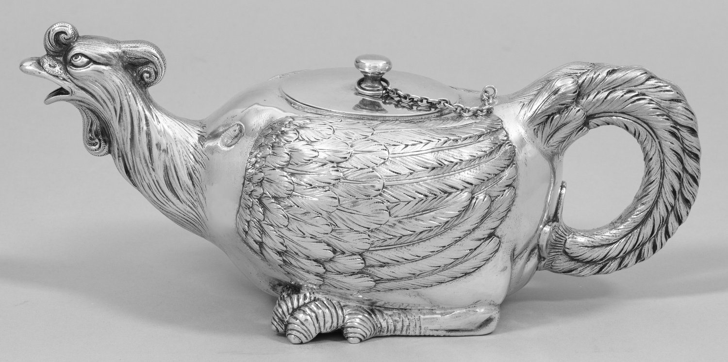 Silber. Über zwei naturalistisch gearbeiteten Krallenfüßen ein gedrückt bauchiger Korpus in Gestalt eines Hahnes mit angelegten, reliefplastisch dargestellten Flügeln und detailgetreuem Gefieder. Die Tülle bestehend aus dem vollplastisch gearbeiteten Hahnenhals und -kopf. Der Schnabel dient als Ausguss, die geschwungenen Schwanzfedern als Kannenhenkel. Obenauf ein flacher Deckel mit schlichtem Balusterknauf an einer Kette befestigt. Innen vergoldet. Gest. Pseudomarken. Gew. ca. 710 g. H. 12,5 cm. L. 29 cm.