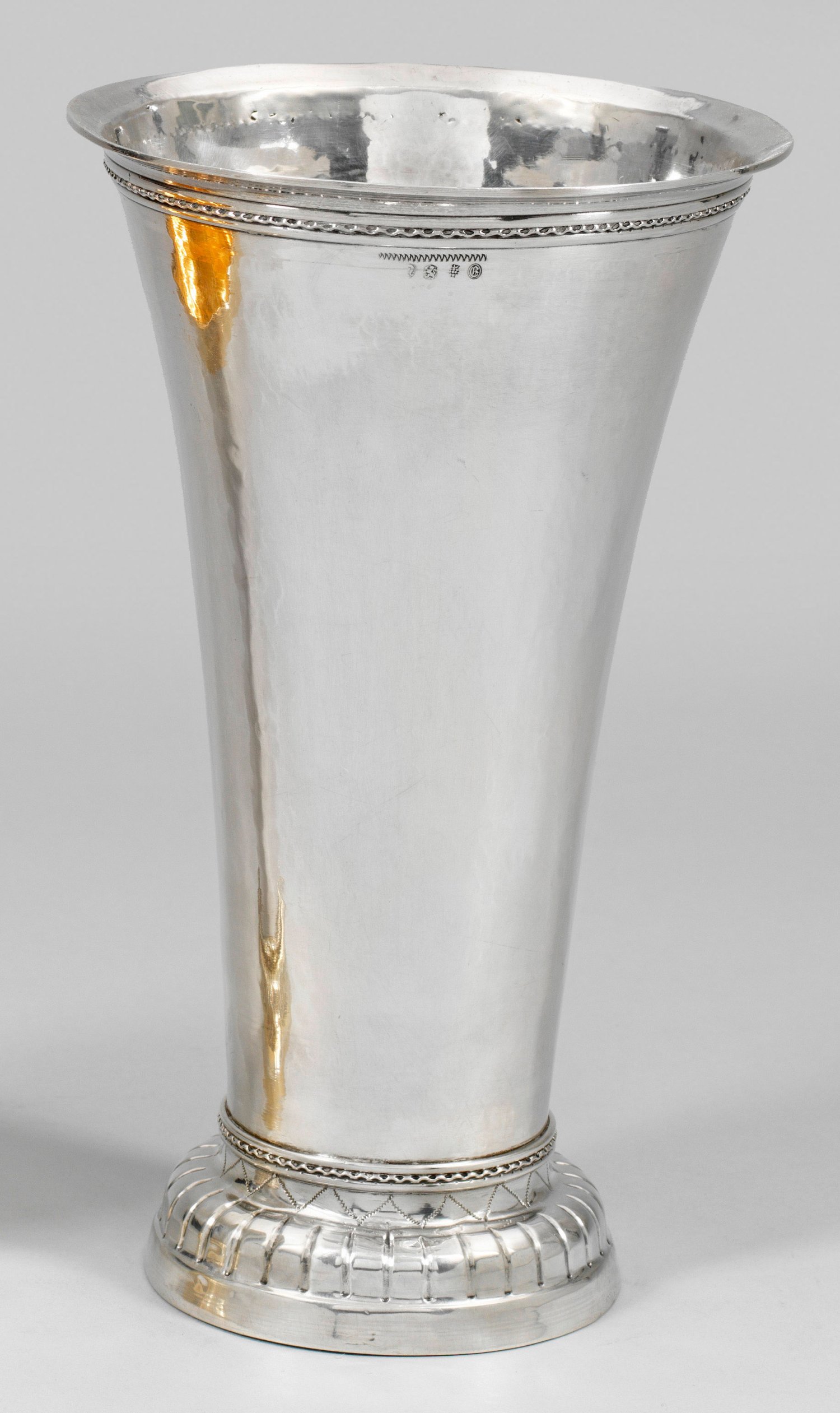 Silber. Über rundem, gewölbt ansteigendem und umlaufend godroniertem Stand konischer, zum Rand hin weit ausschwingender Korpus mit feinem Hammerschlagdekor. Unterhalb des mehrfach profilierten Lippenrandes verziert mit wellenförmigem Zierband. Gest.; Pseudomarken. Gew. ca. 725 g. H. 28 cm.