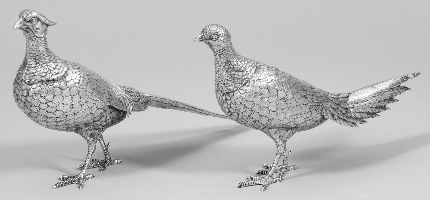 An exceptional pair of German Sterling silver pheasants. Standard mark 925, maker´s mark. Dutch remarking.