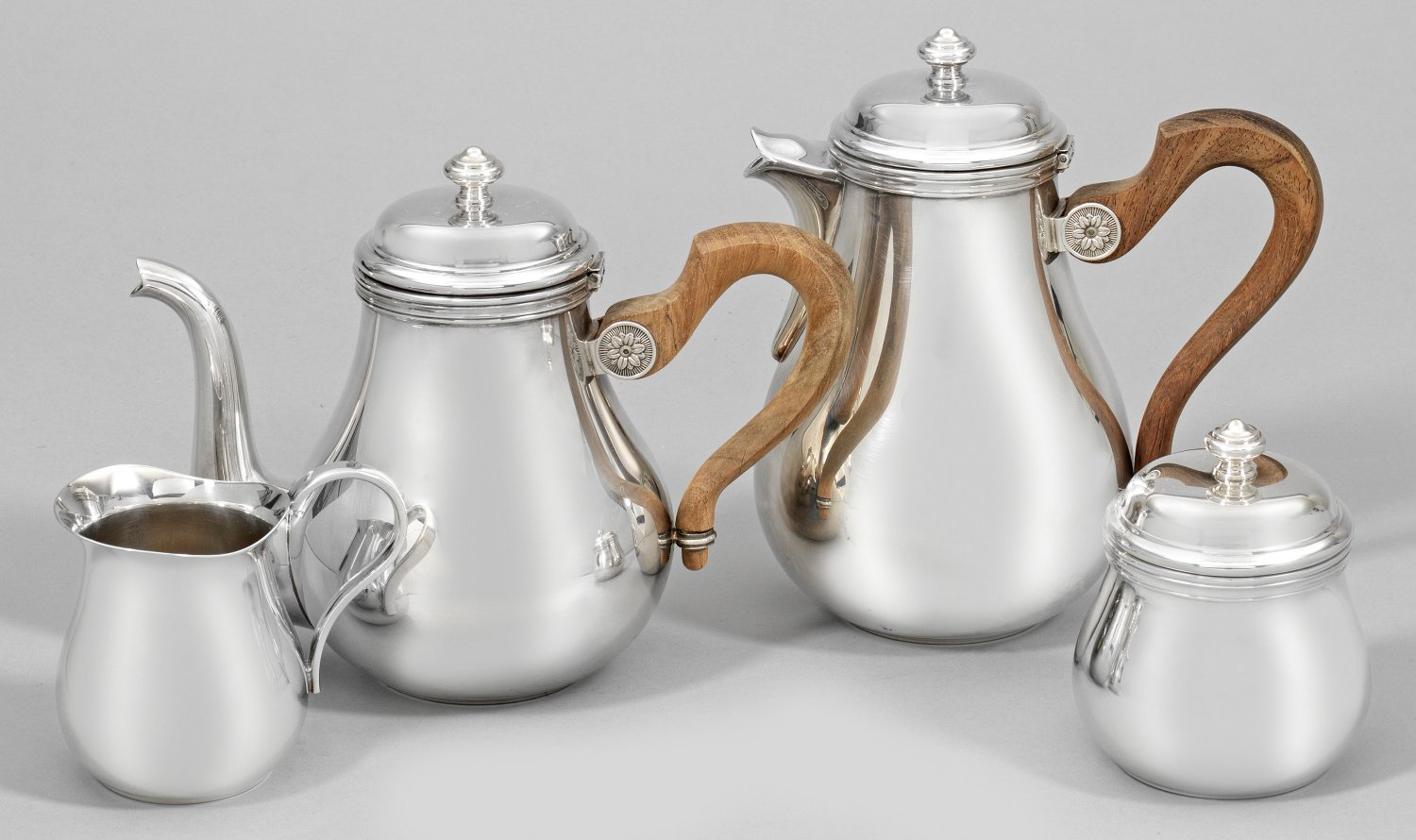 Plated. 4-tlg.; Kaffee- und Teekanne, Zuckerdose und Sahnegießer. Über flachem Stand birnförmiger, glatt eleganter Korpus. Gering ansteigend aufgewölbter Scharnierdeckel mit gedrücktem Balusterknauf. Kurzer, mittig angesetzter Konsolausguss bzw. tief angesetzter Röhrenausguss. Gekanteter Ohrenhenkel aus fein meliertem und gemasertem Holz, am Ansatz mit runder, von reliefierter Rosette verzierter Montierung. Gem.; Herstellerzeichen. H. 9,5 cm - 20,5 cm.