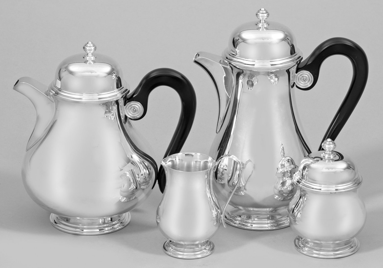 Sterlingsilber. 4-tlg.; Kaffee- und Teekanne, Zuckerdose und Sahnegießer. Über rundem, mehrfach getrepptem Stand birnförmiger, glatt eleganter Korpus. Haubenartig aufgewölbter Scharnierdeckel mit korrespondierend getrepptem Rand und gedrücktem Balusterknauf. Tief angesetzter Konsolausguss. Schwarz mattierter Ohrenhenkel, am Ansatz mit runder, von konzentrischen Kreisen verzierter Montierung. Teilw. innen vergoldet. Gest. 925, Herstellerzeichen. Gew. zus. ca. 1780 g. H. 10 cm - 23 cm.