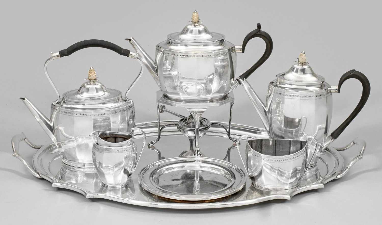 Silber. 7-tlg.; Kaffee-, Tee-, Heißwasserkanne mit Rechaud, Zuckerschale, Sahnegießer und großes ovales Henkeltablett. Über flachem Stand zwölffach facettierter, hoher, konischer Korpus. Gekantete Schulter, übergehend in kurzen, eingezogenen Hals. Scharnierter, bombierter Deckel mit Bekrönung in Form eines vollplastischen Pinienzapfens aus Bein. Korrespondierender, tief angesetzter Röhrenausguss. Unterhalb der Schulter fein graviertes Ornamentband mit Kelchblüten-, Punkte- und Volutendekor sowie zart guillochierte, wellenförmige Zierlinien. Ohrenförmiger Henkel aus ebonisiertem Holz. Als Beigabe ein kleiner Teller. Gest., Beschaumarken, Jahresbuchstabe "b" bzw. "d", Herstellerzeichen. Gew. zus. ca. 5480 g. H. 9 cm - 33 cm. Tablett: 64 cm x 41,5 cm.