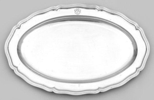 Silber. Länglich ovale Form. Vertiefter, glatter Spiegel mit gemuldetem Anstieg. Breite Fahne und mehrfach profilierter, passig geschweifter Rand. Auf der Fahne fein graviertes Wappen des niedersächsischen Adelsgeschlechts von Brandis. Gest. 800, Herstellerzeichen. Gew. ca. 2050 g. 60 cm x 41 cm.