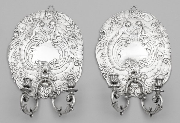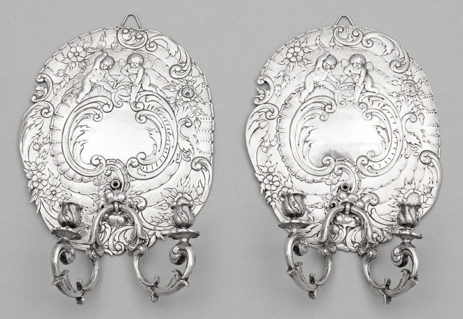 2-flg.; Ovales, gering gewölbtes Wandschild üppig verziert mit Rocaillen, Voluten und Rosenblüten, mittig eine freie Kartusche, gerahmt von volutierten C-Schwüngen. Darüber dargestellt zwei Putti, einer als Amor mit Pfeil und Bogen. Davon ausgehend zwei montierte, blattreliefierte, volutiert geschwungene Leuchterarme in knospenähnlichen Tüllen über blütenförmigen, flachen Traufschalen endend. Rückseitig graviert "183" und Öse zum Aufhängen. Bohrung für Elektrifizierung. Gest., Pseudomarken. Gew. zus. ca. 1070 g. H. 32 cm. B. 20,5 cm.