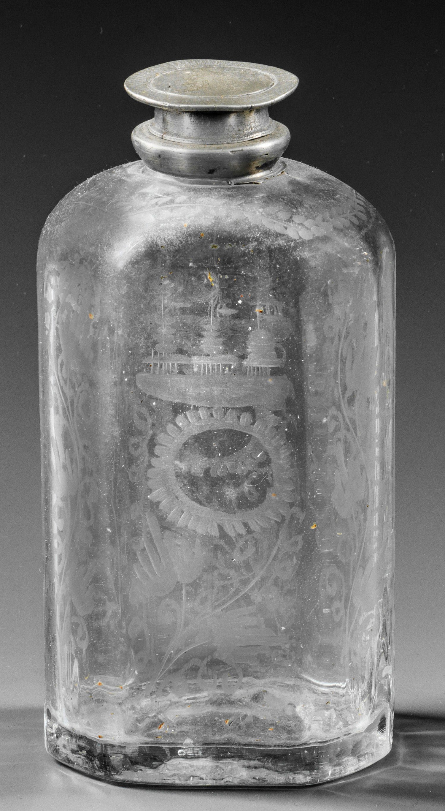 Farbloses, leicht graustichiges Glas. Querachteckige Form, gerundete Schulter. Matt geschnittener, stilisierter Dekor aus Blütenstängeln, Blattranken und Landschafts- bzw. Architekturmotiven. Zinnmontierung und -schraubdeckel. H. 16,2 cm.
