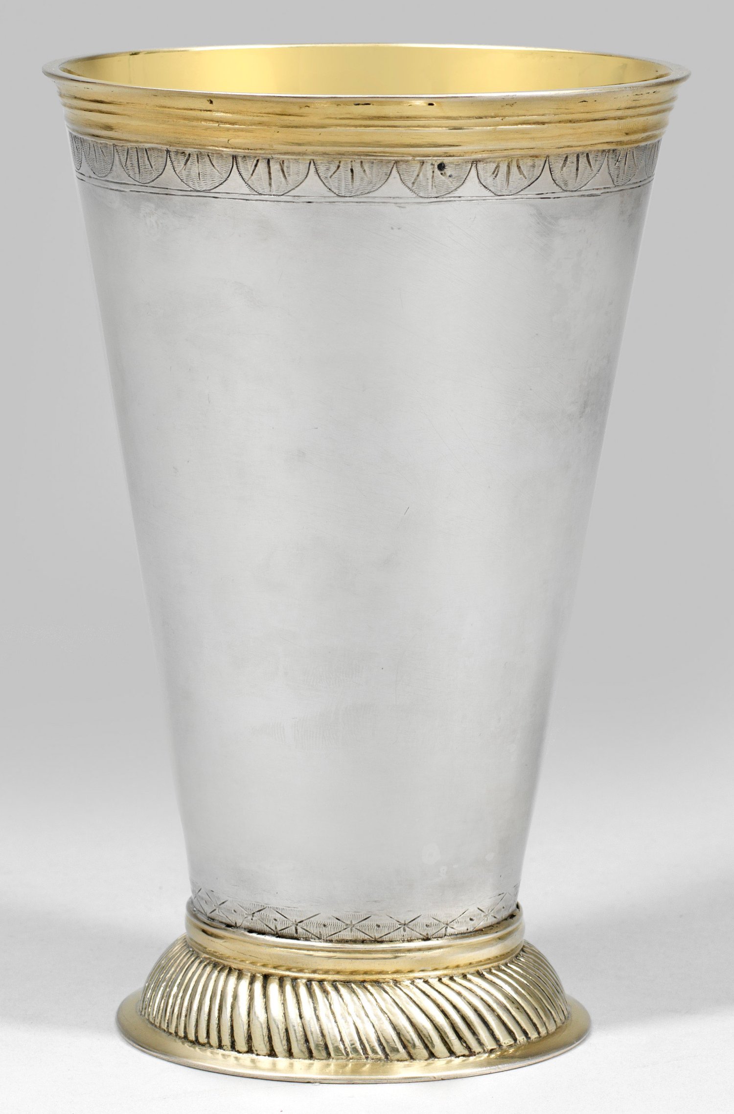 Silber, teilw. vergoldet. Runder, gewölbt ansteigender und umlaufend von schmalen Godronen umzogener Stand mit ausgestelltem Standring. Konischer, zum Rand hin weit ausschwingender, glatter Korpus, übergehend in mehrfach profilierten, getreppten Lippenrand. Oberer bzw. unterer Wandungsrand gerahmt von fein gravierten Ornamentbändern. Innen vergoldet. Gest. 13 Lot, Meister David Wilhelm Schnackenburg (wird Meister 1839). Gew. ca. 550 g. H. 19,5 cm.