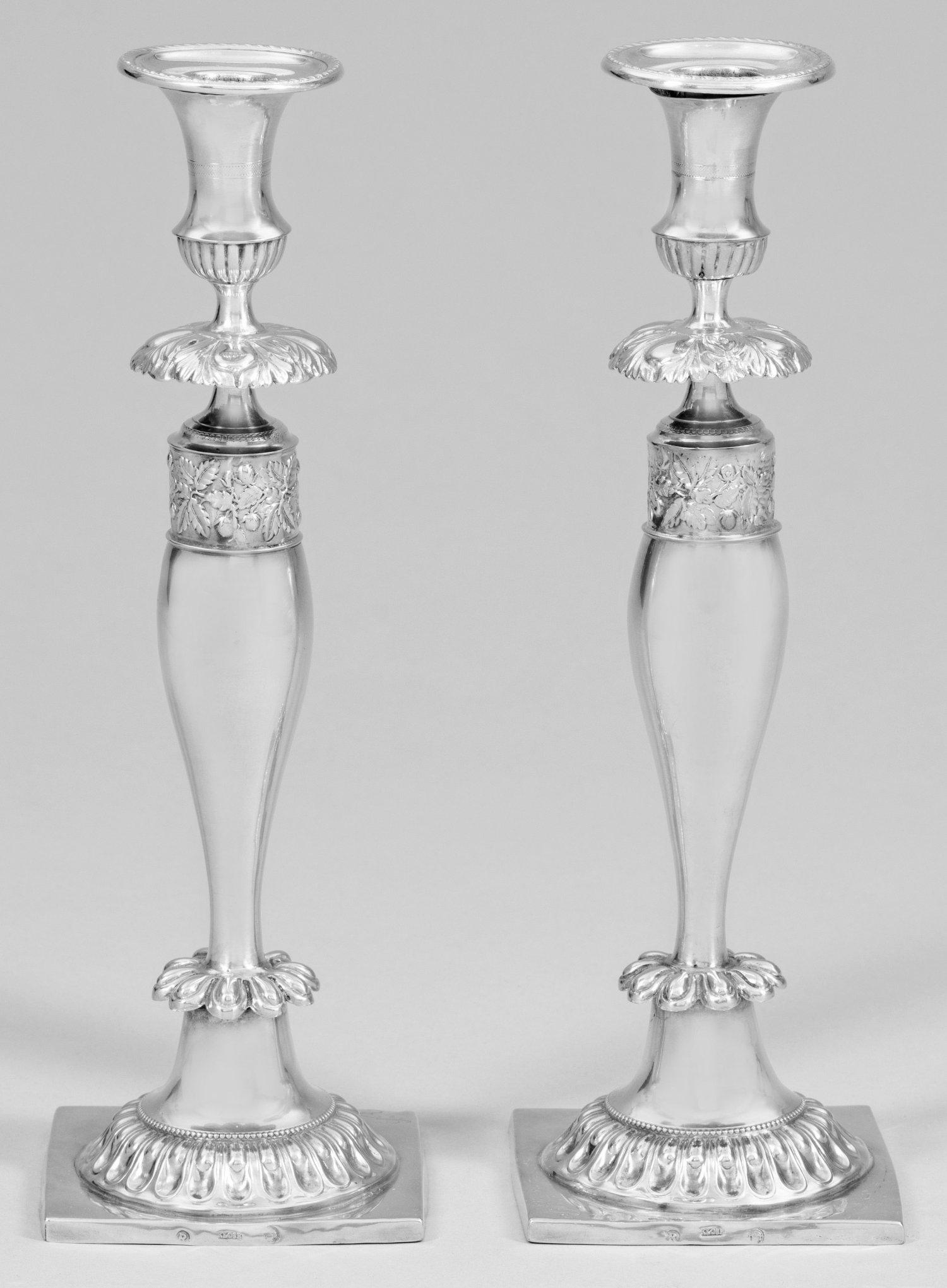 Silber. Quadratische Plinthe, übergehend in trompetenförmigen Stand. Hoher Balusterschaft, am Kapitell umzogen von breitem, reliefiertem Band mit Erdbeerblattranken. Von einem gebogten, weit ausgestellten Blattkranz getragene, hohe Tülle mit ausschwingender, herausnehmbarer Traufschale. Stand umzogen von zartem, kanneliertem und godroniertem Ornamentband. Traufschalen ergänzt. Teilw. besch. und rest.; Gest., Beschauzeichen, Jahresbuchstabe "R". Meister Johann David Klose (wird Meister 1816). Gew. zus. ca. 395 g. H. 29 cm.