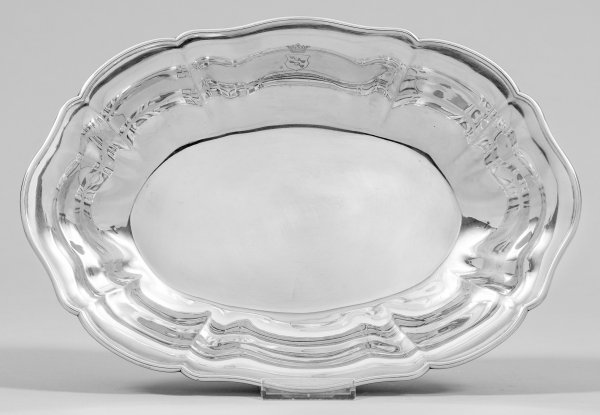 Silber. Ovale, tief gemuldete Form. Glatter Spiegel, übergehend in ansteigende Fahne und blütenförmig geschweiften, profilierten Rand. Auf der Fahneninnenseite ein graviertes und mit Adelskrone bekröntes Wappen. Gest., 12 Lot, Meister Johann Christoph Demessieur (wird Meister 1822). Gew. ca. 710 g. H. 6 cm. 36,5 cm x 25 cm.