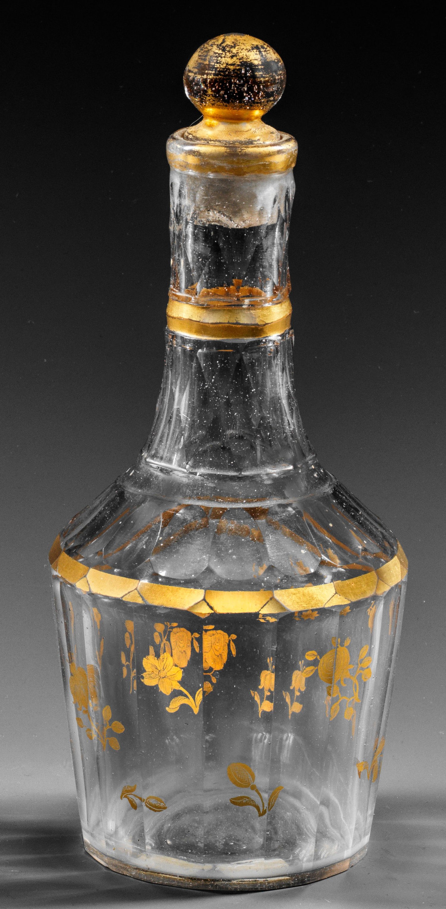 Farbloses, leicht graustichiges Glas, geschliffen. Konischer Korpus mit abgesetzter Schulter, in einen Enghals einschwingend, gegliedert durch unterschiedliche Schliffformen. Auf der Wandung Blumendekor in radierter Goldmalerei. Kugelförmiger, vergoldeter Stöpsel. H. 21 cm.