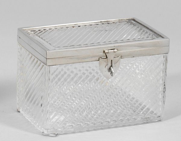 Rechteckig. Farbloses, geschliffenes und poliertes Glas mit scharnierter Silbermontierung. Die Wandung flächendeckend gegliedert durch profilierte Rippung. Schauseitig appliziertes Schlüsselschild sowie scharnierter Überfallriegel. Best.; Gest. 13 Lot, Beschauzeichen, Meister Johann Martin Schott (tätig seit 1811). H. 9,5 cm. 14,5 cm x 9,5 cm.