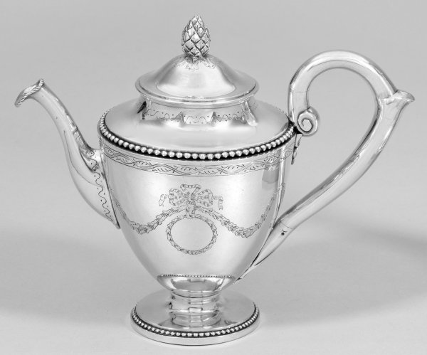 Silber. Flacher Rundfuß, übergehend in sich konisch erweiternden, über der Schulter eingezogenen Korpus. Glatte Wandung umzogen von fein gravierten Festons und Zierranken. Die Ränder abgesetzt durch reliefplastischen Perlfries. Gering gewölbter Deckel mit großem, vollplastischem Pinienknauf. Tief angesetzter, sich konisch stark verjüngender Röhrenausguss, der ausgestellte Rand von Kordelband gerahmt. Volutierter Ohrenhenkel. Gest., Tremolierstrich, Beschauzeichen, Jahresbuchstabe "R", Meisterzeichen Willem Langbeke (tätig um 1790). Gew. ca. 570 g. H. 17 cm.
