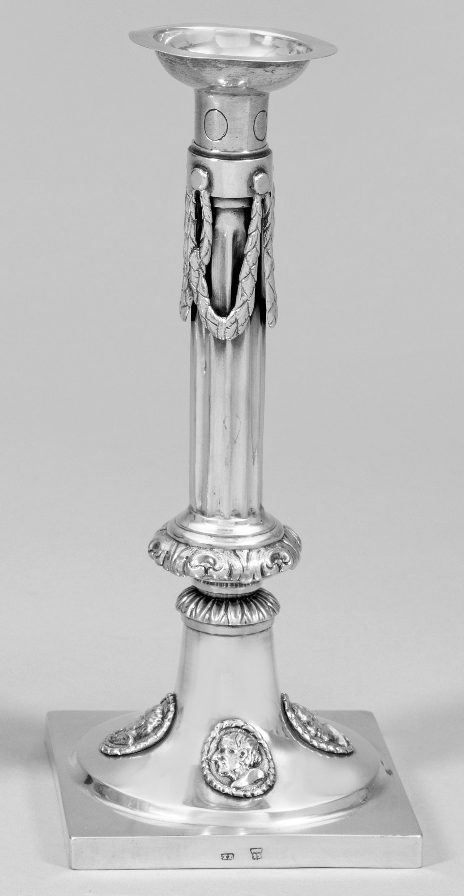 A late Neoclassicism Cologne silver candlestick by Theodorus Becker (master since 1780). Monogrammed "GF". Assay and master´s mark.