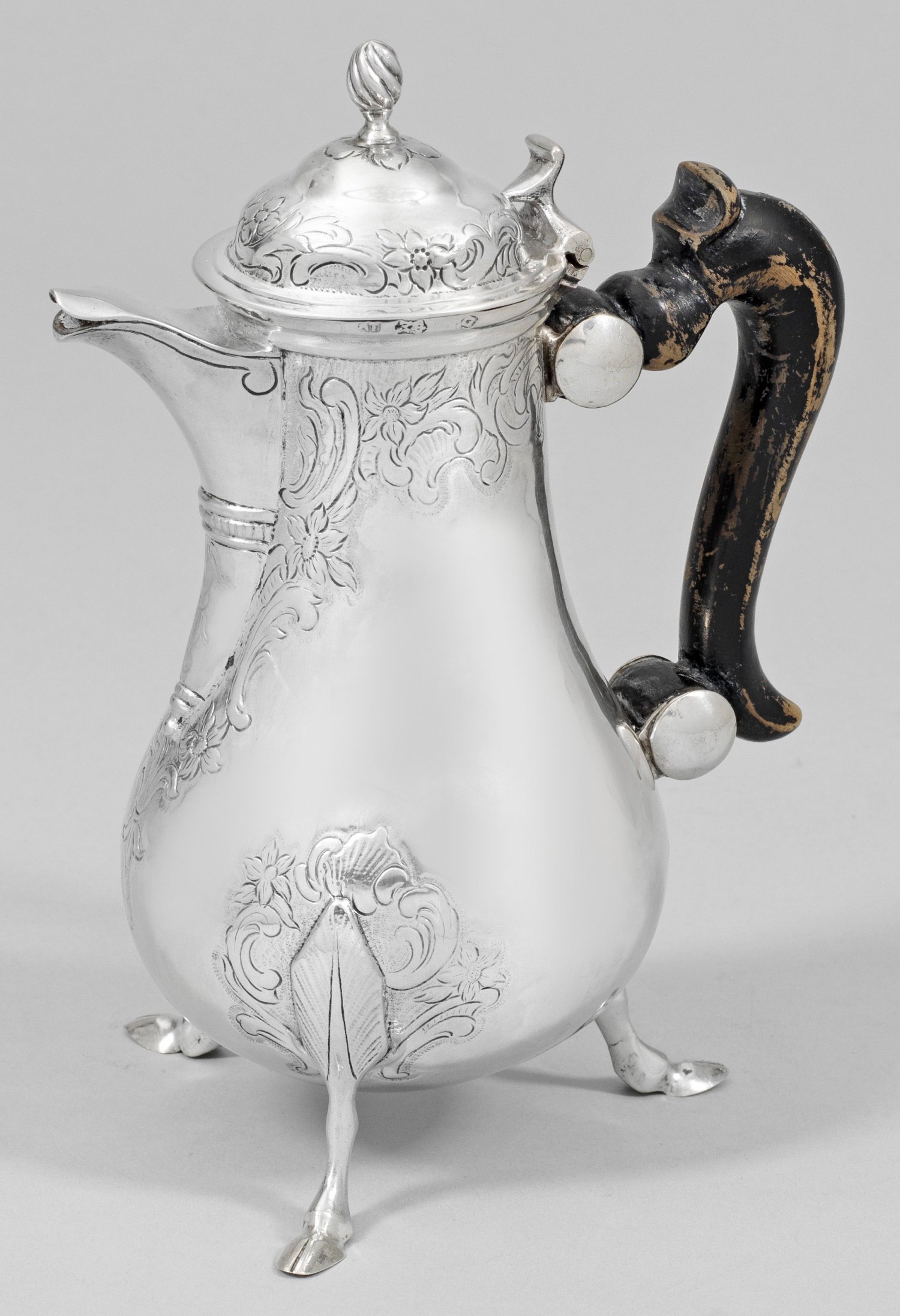 Silber. Drei stilisierte Huffüße, am Ansatz mit lanzettförmigem Blatt verziert, übergehend in sich bauchig erweiternden Korpus mit schlankem Hals und tief angesetztem Konsolausguss mit schnabelförmiger, abgedeckter Tülle. Leicht aufgewölbter, in Balusterknauf endender Scharnierdeckel. Deckel und Korpus verziert mit gravierten Rocaillen und Blüten. Seitlich Ohrenhenkel aus ebonisiertem Holz. Minim. altersbedingte Gebrauchsspuren. Bisher unidentifiziert gest., Meister wohl A. Telmon (tätig seit ca. 1756); Gew. ca. 395 g. H. 20 cm.