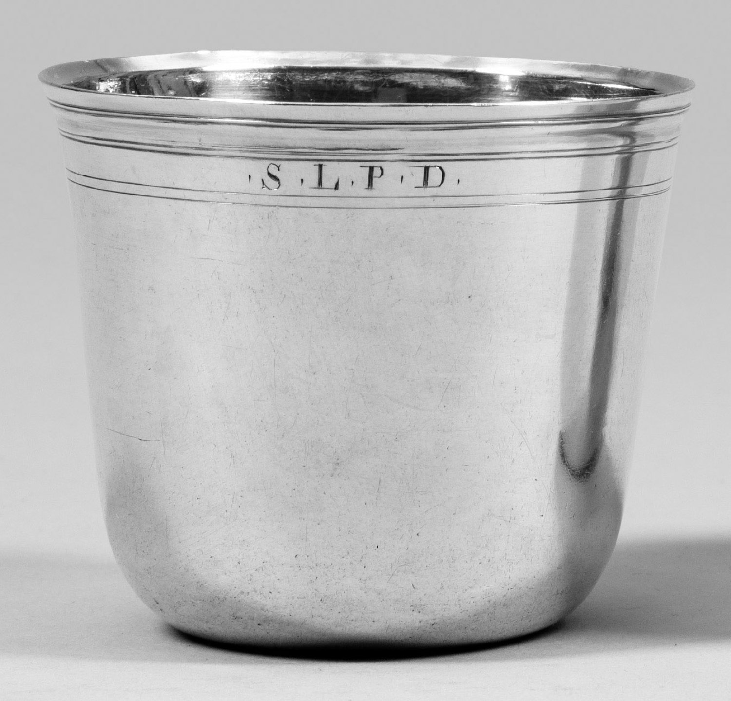 Silber. Über eingezogener Standfläche sich konisch erweiternder Korpus. Gering ausgestellte, glatte Wandung, übergehend in durch schmale Profillinien akzentuierten, gering ausgestellten Lippenrand. Unterhalb graviert "S.L.P.D.". Aufgewölbter Innenboden. Gest., Beschauzeichen, Gebühren- und Quittungsstempel, Pächter Eloi Brichard (tätig 1756-1762), Jahresbuchstabe "R" und undeutl. Meistermarke. Gew. ca. 75 g. H. 5,5 cm. D. 6,5 cm.
