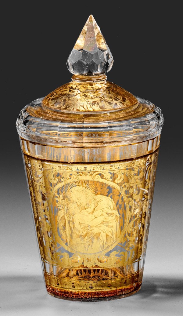 Farbloses Glas, geschliffen. Leicht konischer Becher, vielfach facettiert, der glockenförmige Deckel mit korrespondierend geschliffenem Rand und Tropfenknauf. Zwischen den Schichten feiner, radierter Golddekor. Schauseitig ein Ovalmedaillon mit dem Hl. Josef, das Jesuskind in den Armen haltend, rücks. eine Blumenvase, dazwischen flächendeckender Dekor aus Akanthusranken mit Blüten- und Früchtegehängen. Im Boden eingelassenes, ligiertes Marienmonogramm mit Strahlenkranz auf Siegellack- bzw. rubinrotem Fond. Der Deckel entsprechend dem Becher mit Akanthus- und Blütendekor in radierter Goldfolie. H. 13,2 cm.