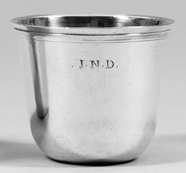 Silber. Über eingezogener Standfläche sich konisch erweiternder Korpus. Gering ausgestellte, glatte Wandung mit mehrfach profilierter Randzone, übergehend in schmalen Lippenrand. Unterhalb graviertes Monogramm "J.N.D.". Aufgewölbter Innenboden. Gest., Beschauzeichen und dat., Meister Jean-Joachim Jouette (tätig ab 1759). Gew. ca. 75 g. H. 5,5 cm. D. 6,5 cm.