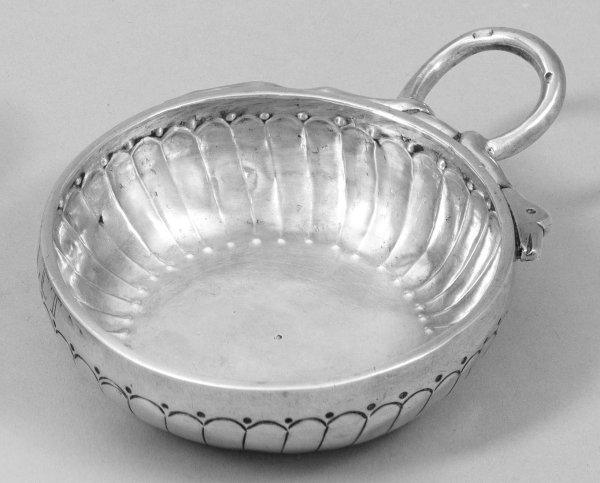 Silber. Über flachem, rundem Stand, gerundeter, tief gemuldeter und dickwandiger Korpus mit plastischem Ringgriff in Gestalt einer stilisierten Schlange. Wandung umzogen von graviertem Zungenfries mit Punktedekor. Auf dem Wandungsrand graviert bez. "A. JVILLET". Teilw. undeutl. gest. zweifaches, bisher unbekanntes Meisterzeichen "I.B". Gew. ca. 80 g. H. 3,5 cm. D. 8,5 cm.