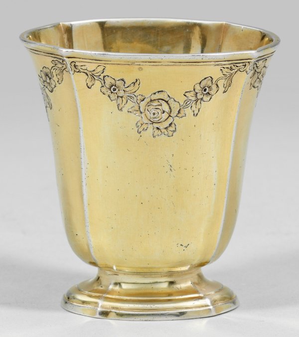 sog. Faltbecher. Silber, voll vergoldet. Ovaler, eingezogener Fuß übergehend in konisch ausschwingende, tulpenförmige Kuppa mit glatter Wandung und geringfügig ausgestelltem Lippenrand. Korpus gegliedert durch vier vertikale, gekniffene Grate sog. "à quatre côtes pincées". Unterhalb des Lippenrandes umlaufend meisterhafte, fein ziselierte Blütenfestons. Gest. 13 Lot, Beschauzeichen, Meister Jean-Jacques Kirstein (Meister seit 1760), dreifacher Garantiestempel (1838-1919). Gew. ca. 115 g. H. 8 cm. 7,5 cm x 6 cm.