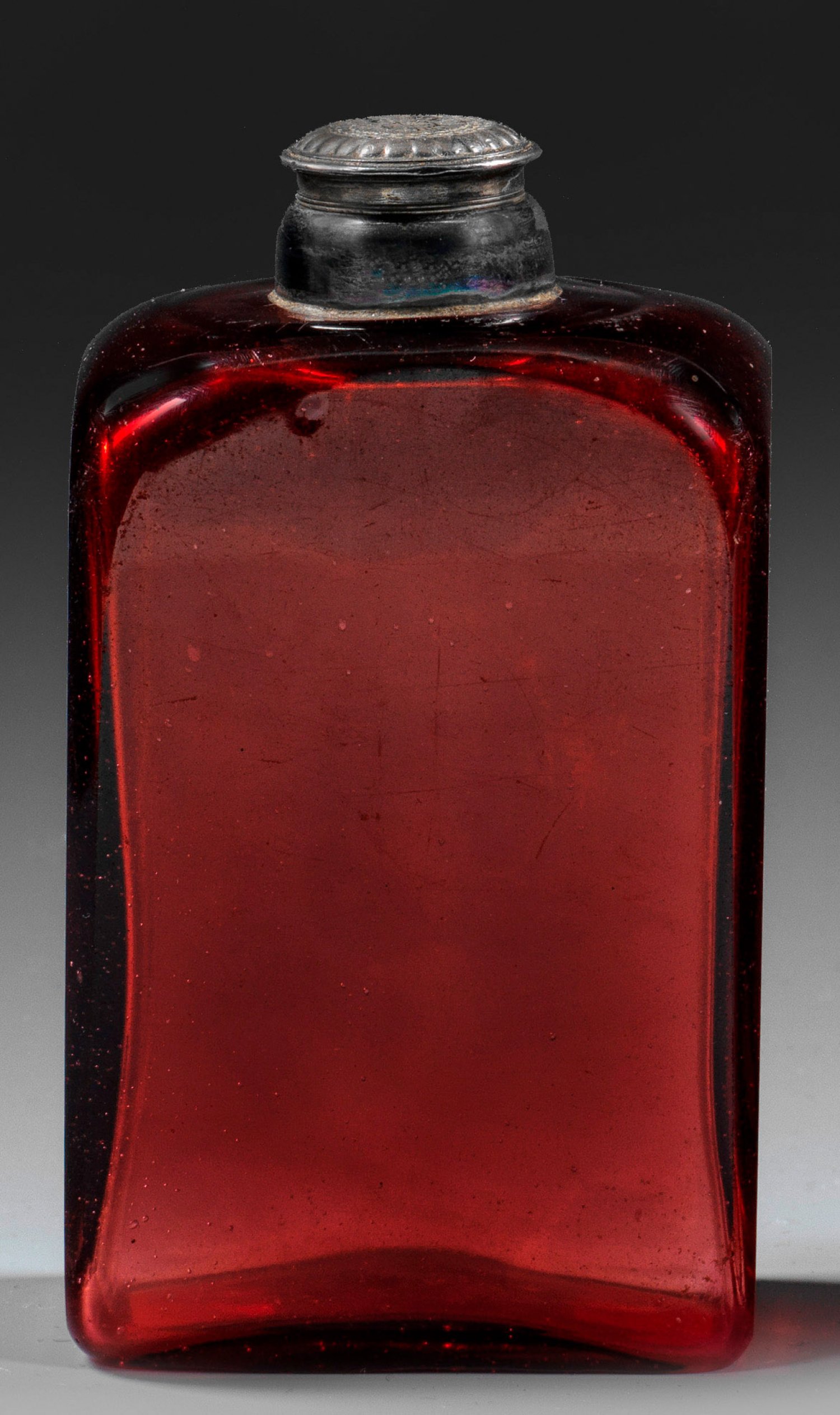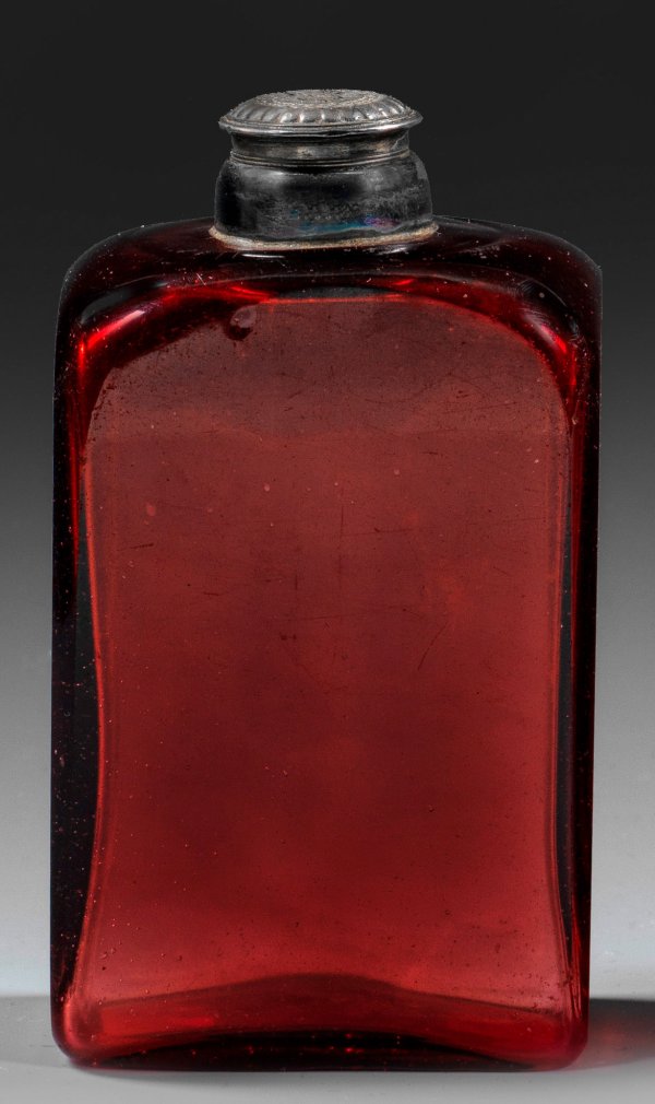 A German gold ruby glass flacon with silver screw top.