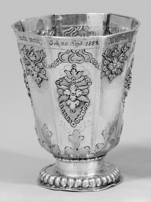 Silber. Von Stabfries gerahmter, gedrückter Rundfuß, übergehend in kurzen, gekehlten Schaft. Am Ansatz gerundeter, von graviertem Blattkranz umzogener, konischer Korpus. Die Wandung durch vertikale Grate achtfach facettiert gegliedert und mit reliefplastischen Festons und Blütenbündeln verziert. Auf dem Rand spätere deutsche Widmung "Herz, gewissen, glas und wein Müssen pur und reine sein" mit bekröntem Monogramm "K. P." sowie " Geb. 20. Sept. 1883". Gest., Beschaumeister Michail Bobrowschtschikow, Meister Timofej Filippow Silujanow (Meister seit 1760). Gew. ca. 130 g. H. 9,5 cm.