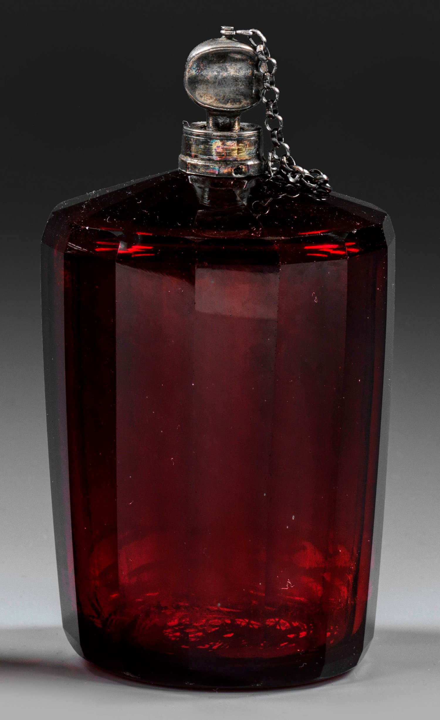 Runde, nahezu zylindrische Form, flache Schulter, vielfacher Facettenschälschliff, der Boden plangeschliffen. Mündung silbermontiert, der Silberstöpsel daran gekettelt. H. 12 cm.