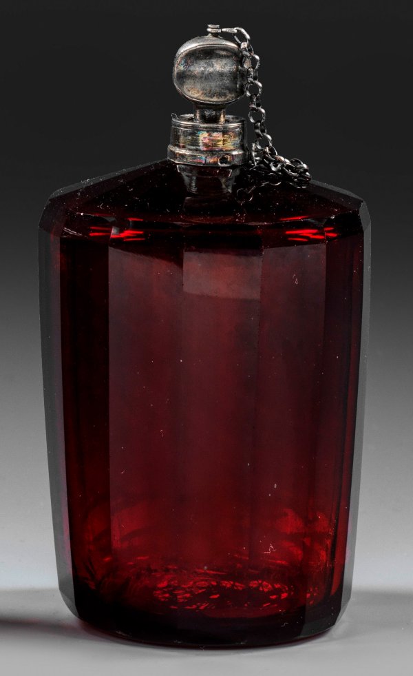 A German cut gold ruby glass flacon with silver screw stopper.