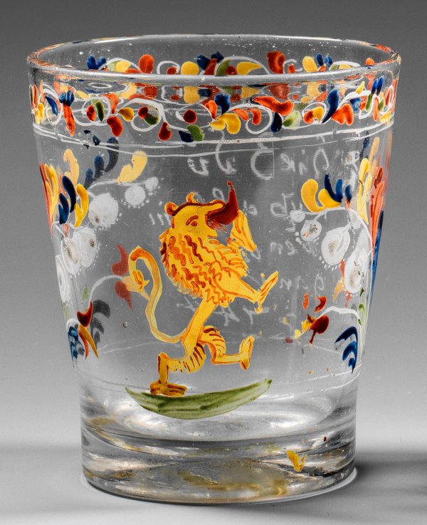 Farbloses Glas. Leicht konische Form. Polychromer Emaildekor aus einem stehenden Löwen, Blumen und Spruch mit Dat. 1744. H. 9,8 cm.