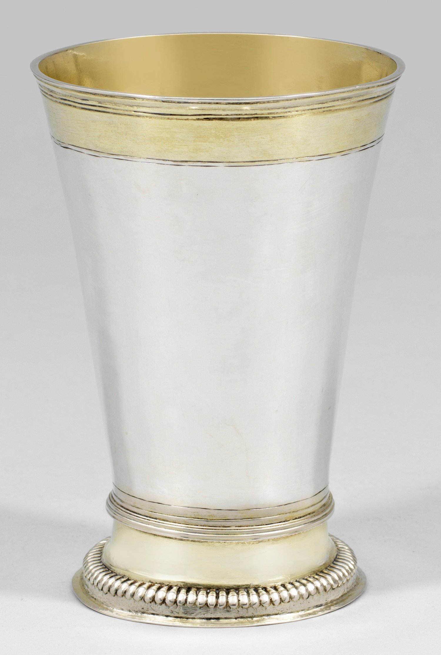 Silber, teilw. vergoldet. Über rundem, gewölbt ansteigendem und umlaufend von schmalem Stabfries umzogenem Stand konischer, zum Rand hin weit ausschwingender, glatter Korpus. Durch schmale Profillinien abgesetzter Ansatz und Randzone. Innen vergoldet. Gest., Beschauzeichen, Meister Johann Conrad Freudenberg(er) (wird Meister 1695). Gew. ca. 240 g. H. 15,5 cm.