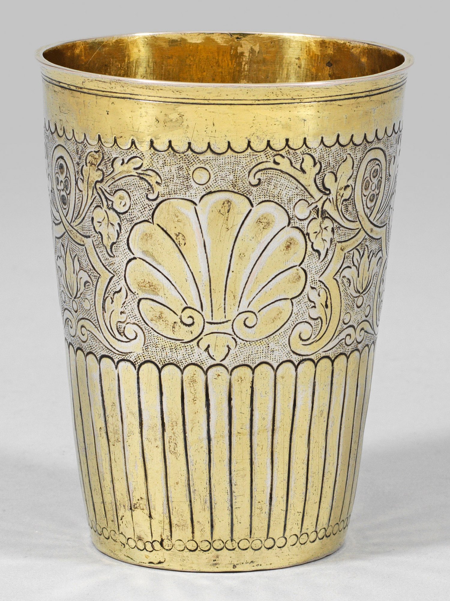 Silber, teilw. vergoldet. Konischer Korpus, mit wellenförmig abgesetzter, glatter Randzone, übergehend in profilierten, gering ausgestellten Lippenrand. Untere Wandungshälfte umzogen von schmalem, zungenförmigem Stabfries. Oberhalb verziert mit Muscheldekor, umgeben von fein gravierten, umlaufenden Akanthusblattranken und Bandelwerk über punziertem Grund. Innen vergoldet. Gest., Tremolierstrich, Beschauzeichen, Meister Siegmund Wolfgang Preuss (wird Meister 1694). Gew. ca. 80 g. H. 11 cm.