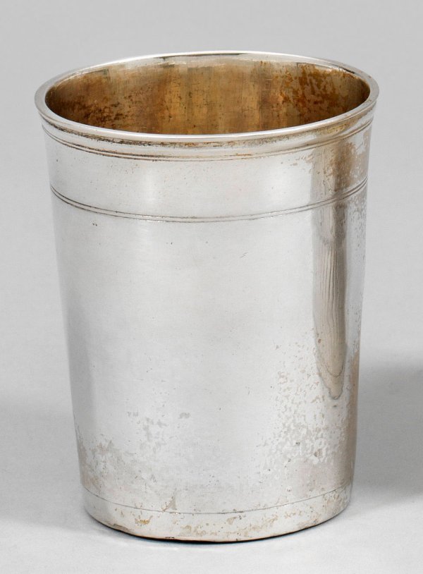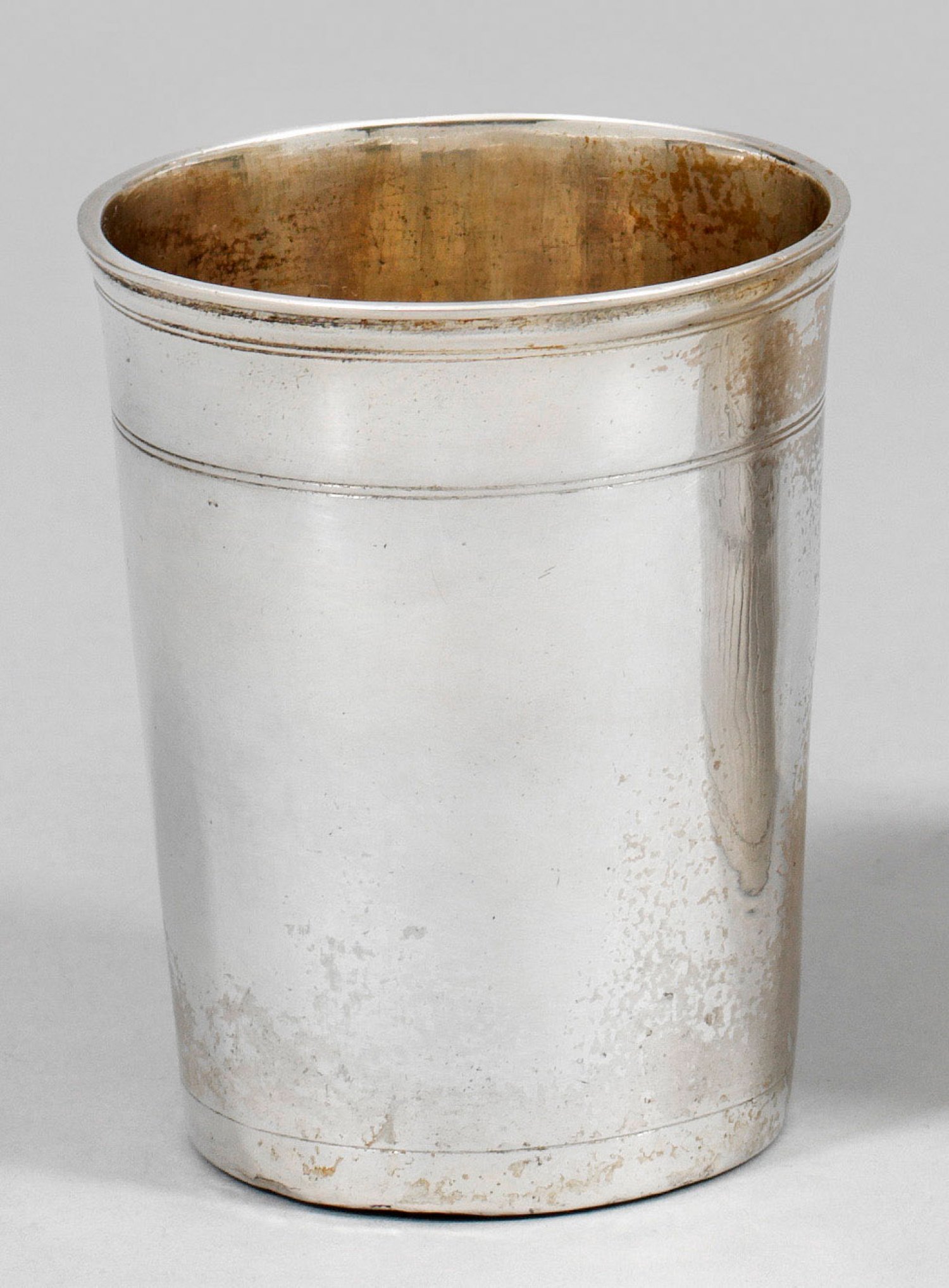 Silber. Konischer Korpus mit glatter Wandung und profiliertem Lippenrand. Innen vergoldet. Gest., Tremolierstrich, Beschauzeichen Meister Ferdinand Schönfeld (wird Meister um 1686). Gew. ca. 90 g. H. 8 cm.