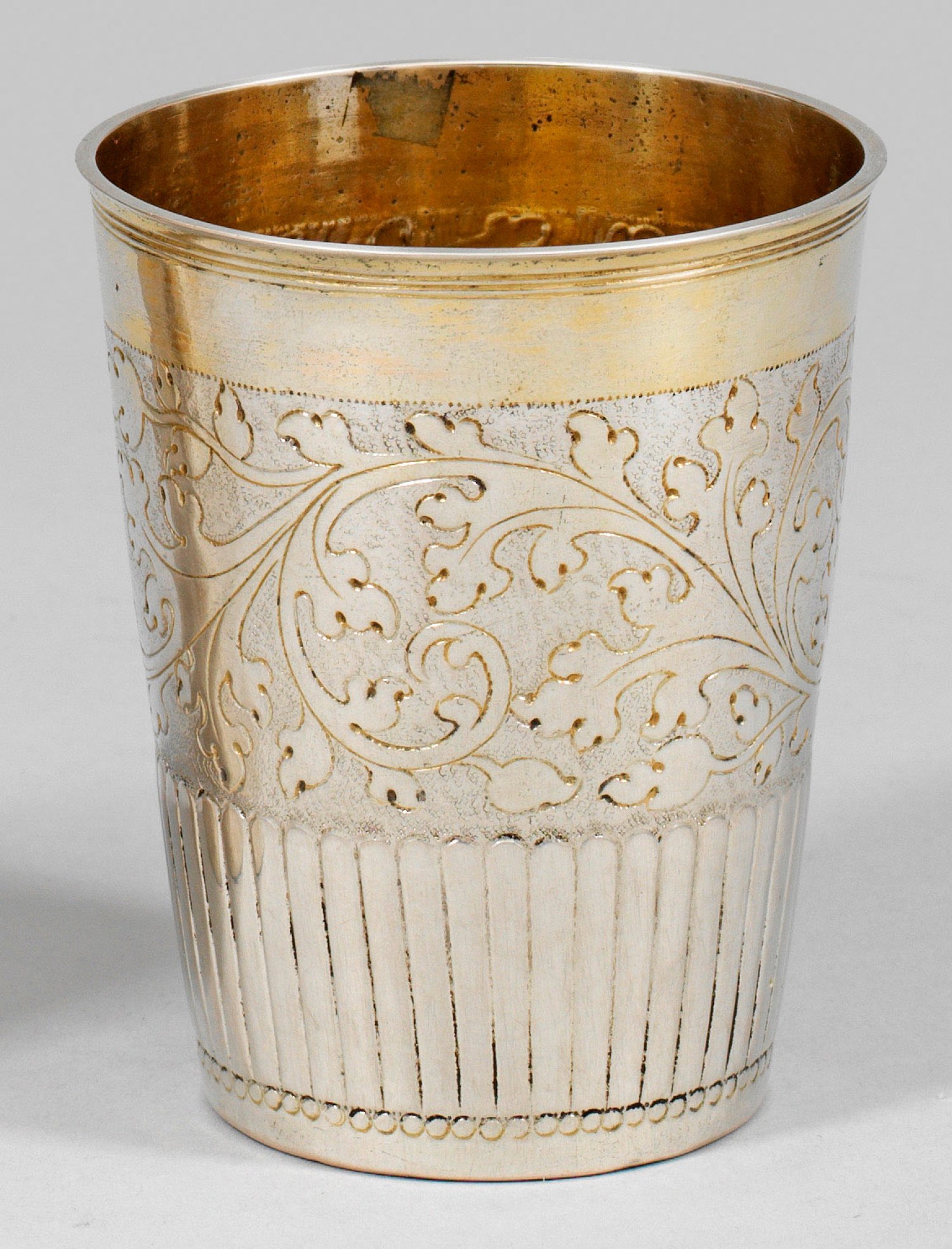 Silber, teilw. vergoldet. Konisch, mit abgesetztem, profiliertem Rand. Untere Wandungshälfte umzogen von schmalem Stab- über Punktfries. Oberhalb fein gravierte, umlaufende Akanthusblattranke über punziertem Grund. Unterseite monogr.; Innen vergoldet. Gest., Beschauzeichen, Meister Gottfried Kittel (wird Meister 1697). Gew. ca. 95 g. H. 9,5 cm.