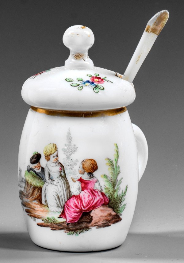 Milchglas bzw. weißlich opalisierend. Fassförmiges Senfgefäß mit Ohrenhenkel und Deckel. Polychromer Emaildekor, schauseitig höfische Kinder in Parklandschaft, auf dem Deckel gestreute Blumen. H. 12 cm (Sengefäß); L. 12,7 cm (Löffel).