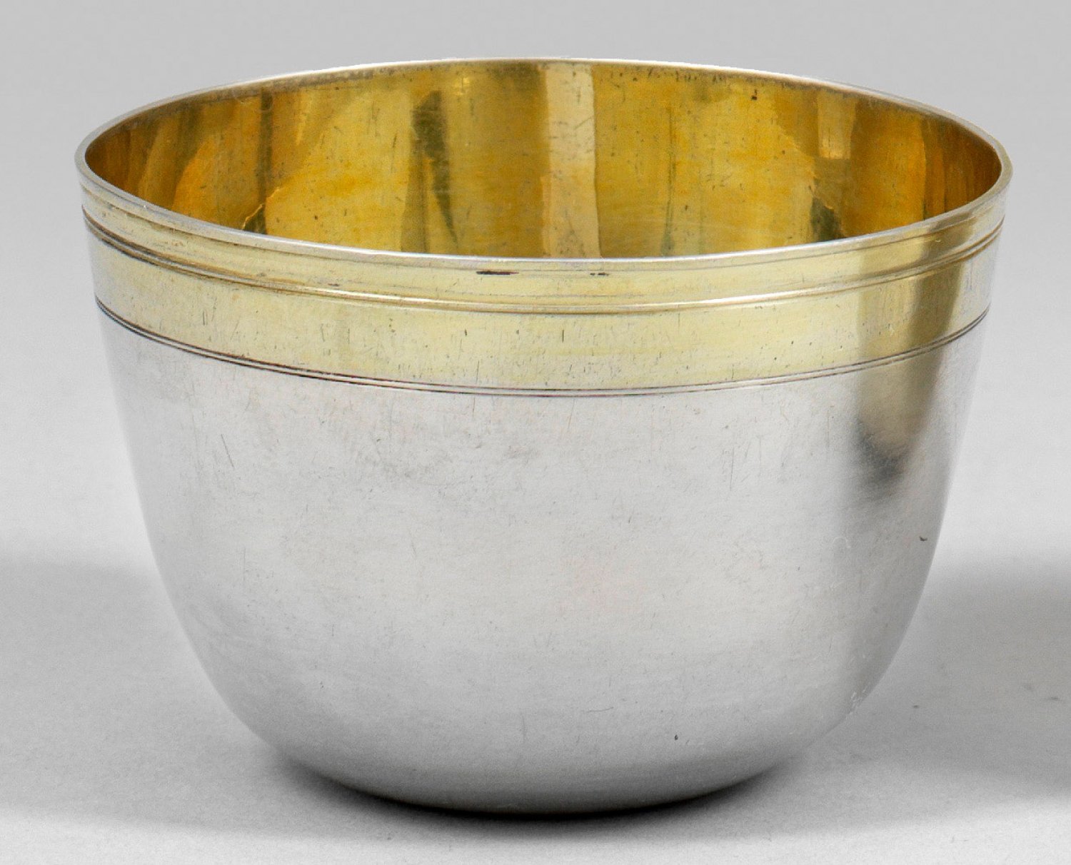 Silber, teilw. vergoldet. Gerundete Standfläche, übergehend in sich konisch erweiternden Korpus mit glatter, unterhalb des Randes durch zarte Profillinien gegliederter Wandung. Innen vergoldet. Gest., Tremolierstrich, Beschauzeichen, Meister Paul Solanier (wird Meister um 1665). Gew. ca. 60 g. H. 4,5 cm.