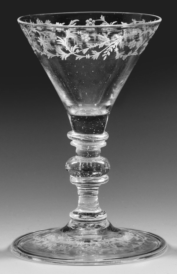 Farbloses Glas. Leicht ansteigender Scheibenfuß mit umgeschlagenem Rand, durch Ringscheiben und einen gedrückten Kugelnodus gegliederter Balusterschaft, konische Kuppa. Unterhalb des Lippenrandes eine sehr fein geschnittene Bordüre aus Blatt- und Blütenranken. H. 13 cm.