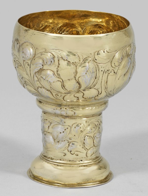 Silber, voll vergoldet. Gewölbter Stand mit flachem Standring. Über zylindrischem, zum Gefäßkörper gehörendem Schaft und gedrücktem, wulstähnlichem Nodus, ausschwingende, gebauchte Kuppa mit glatter Randzone. Wandung und Schaft umzogen von ausladendem, fein getriebenem und punziertem Blattwerk, üppigen Blüten sowie Blattranken. Gest., Tremolierstrich, Beschauzeichen, Meister Reinhold Rühl/Riel (wird Meister 1652). Gew. ca. 130 g. H. 11,8 cm.