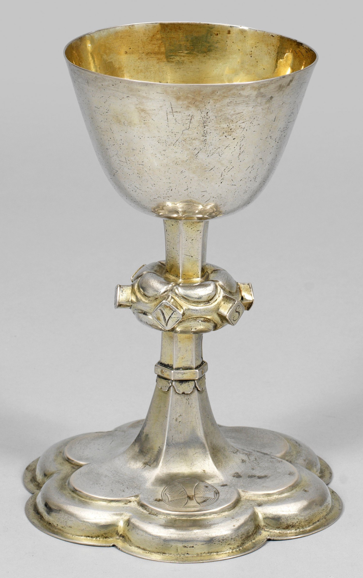 Silber. Zweistufig aufgewölbter, sechspassig blütenförmiger Stand mit ausgestelltem Rand. Auf dem Stand graviertes Tatzenkreuz im Rund-Medaillon. Korrespondierender, sechsfach gekanteter Schaft, mittig mit gedrücktem, leicht gebuckeltem Nodus und sechs Rotuli mit gravierten Majuskeln "IEHSVS". Glockenförmig aufschwingende, glatte Kuppa. Innen vergoldet. Außen teilw. Restvergoldung. Gest., Beschauzeichen, undeutliche Meistermarke. "? B". Gew. ca. 360 g. H. 21 cm.