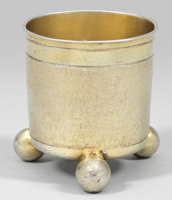 Silber, voll vergoldet. Über drei ausgestellten Kugelfüßen, nahezu konischer Korpus mit profiliertem, geringfügig ausgestelltem Lippenrand. Breite, glatte Randzonen, abgesetzt durch schmale Profillinien. Wandung umzogen von äußerst fein gearbeitetem, sog. Schlangenhautdekor. Gest., Tremolierstrich, Beschauzeichen, Meister Johann Betz (wird Meister um 1649). Gew. ca. 140 g. H. 8 cm.