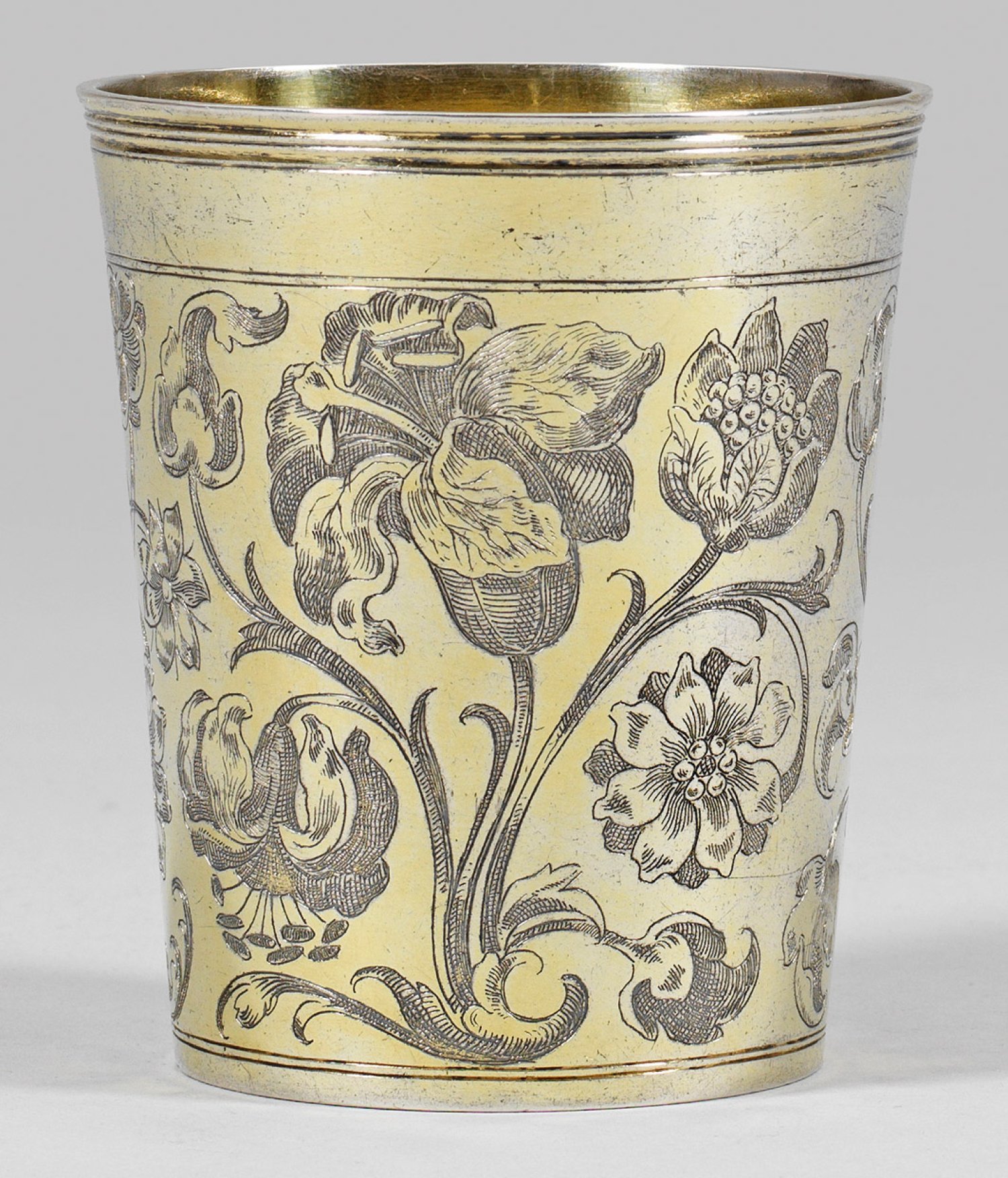 Silber, vergoldet. Konischer, glatter Korpus. Ansatz und Randzone abgesetzt durch schmale Profillinien unterschiedlicher Breite, übergehend in schmalen Lippenrand. Wandung umzogen von zart gravierten und detailreich dargestellten, großen Blüten, u.a. Lilien- und Tulpenblüten, umgeben von rankenden Blattstängeln und geschwungenen Blättern. Gest., Tremolierstrich, Beschauzeichen, Meister mit dem Einhorn wohl Marx Burmeister (wird Meister 1630) oder Stefan Winck(h)ler (wird Meister 1632). Gew. ca. 145 g. H. 9 cm.