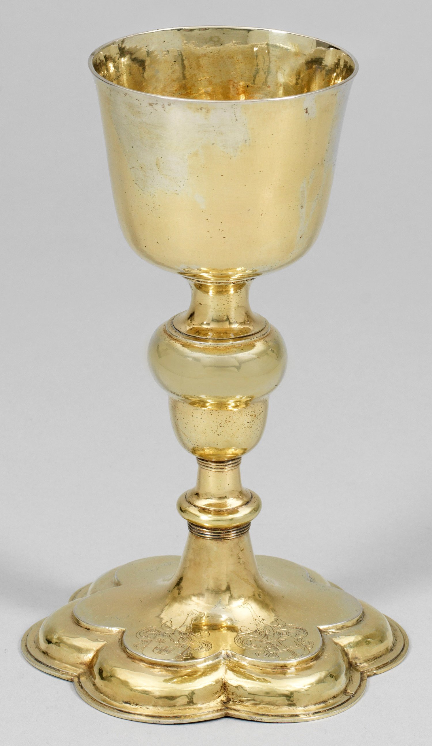 A rare German Gothic gilt chalice with engraved coats of arms probably from a master from the family Orsbach (master since 1678). Assay and master´s mark.