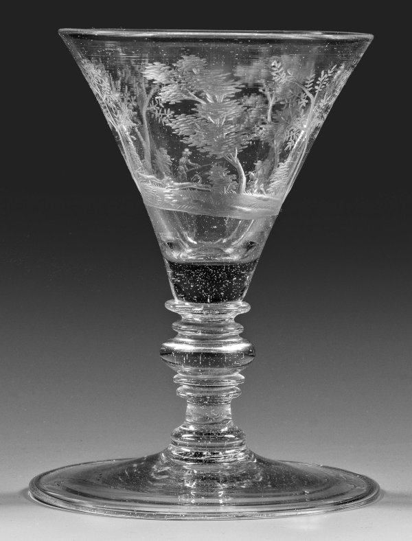 Farbloses Glas, graviert. Mittig leicht hochgezogener Fuß mit umgeschlagenem Rand, durch Scheibennodi gegliederter Balusterschaft, weite, trichterförmige Kuppa. Auf der Wandung umlaufender, fein geschnittener Dekor mit szenischen Darstellungen. In baumbestander Landschaft ein Jäger und Hund beim Verfolgen eines Hasens sowie an einem Bachufer stehender Angler. H. 12,3 cm.