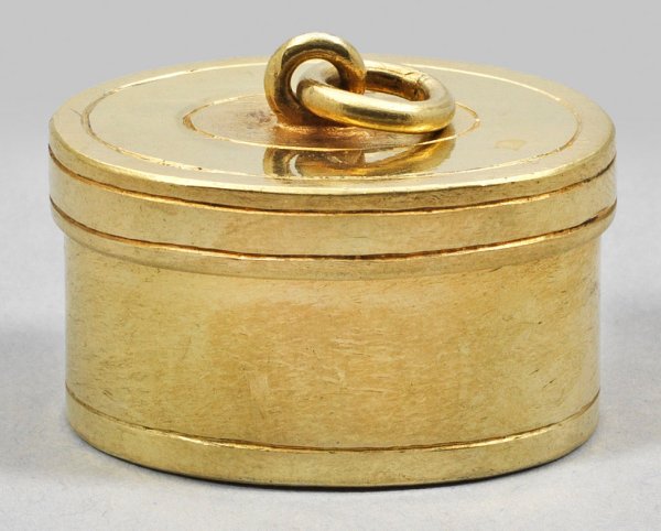 Silber, vergoldet. Ovale Form mit gerader Wandung. Flacher Stülpdeckel, mehrfach von zarten Profillinien gegliedert. Zentral eine Öse mit Ring als Aufhängung. Tremolierstrich, Beschauzeichen, Meister Hans Georg I Brenner/Prenner (wird Meister 1590). Gew. ca. 20 g. H. 1,5 cm. 3 cm x 2,2 cm.
