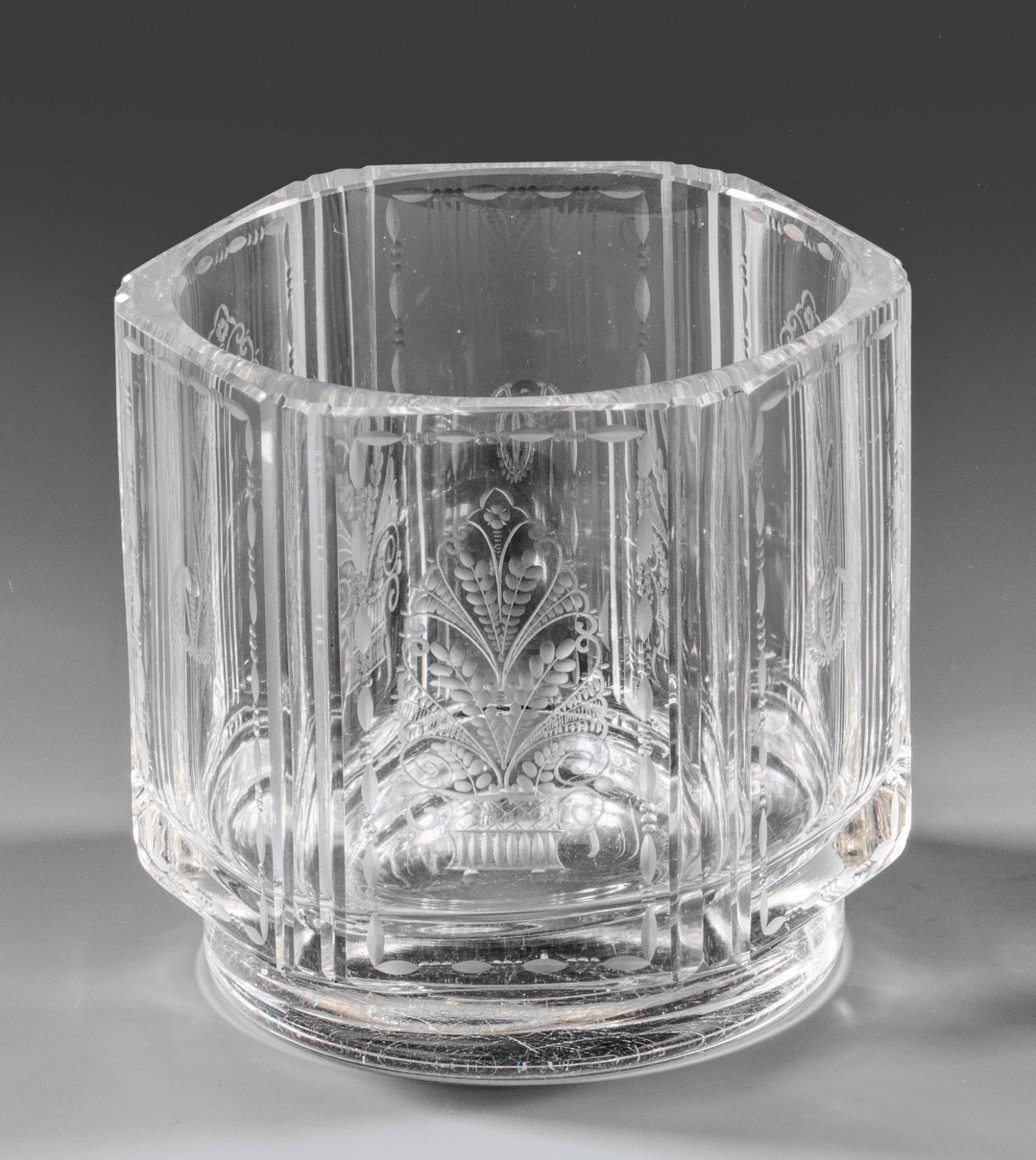 Auf rundem Fuß abgesetzte, durch Schälschliff und Keilschliff gestaltete, sechseckige Form. Auf den Seiten jeweils alternierender Dekor in Mattschnitt kombiniert mit Schliff und Blankperlen aus stilisierten Blumenkörben sowie einem kleinen Lorbeerkranzmotiv. H. 13,5 cm; D. 13 cm.