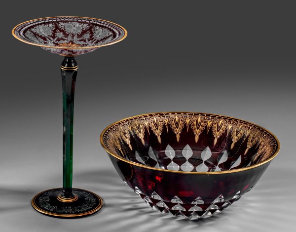 Farbloses Glas, rubiniert. Schale von Hermann Eiselt mit Schliff-, Gold- und Emaildekor, die Tazza mit geblänktem, teilw. hellgrün lasiertem Schnittdekor und Goldmalerei. Tazza-H. 23,2 cm; Schalen-D. 23,2 cm.
