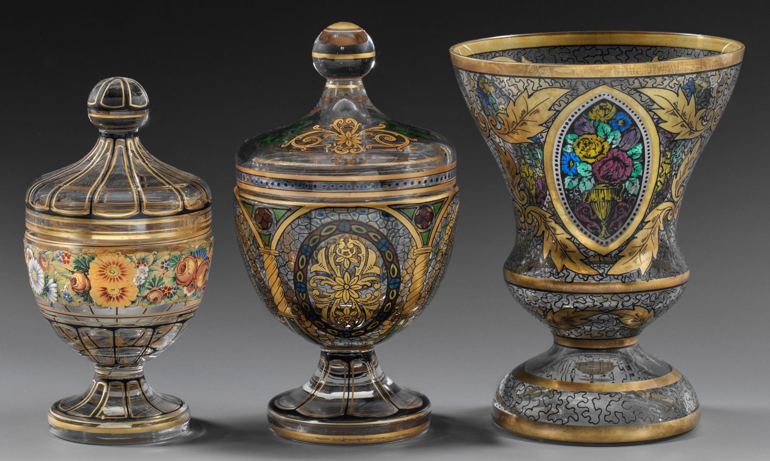 Farbloses Glas, Dekor in polychromer Emailmalerei, Gold und Schwarz. H. 19 cm-22 cm.