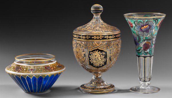 A collection of three Bohemian and Silesian glass objects with polychrome painted enamel, gold and black decor.